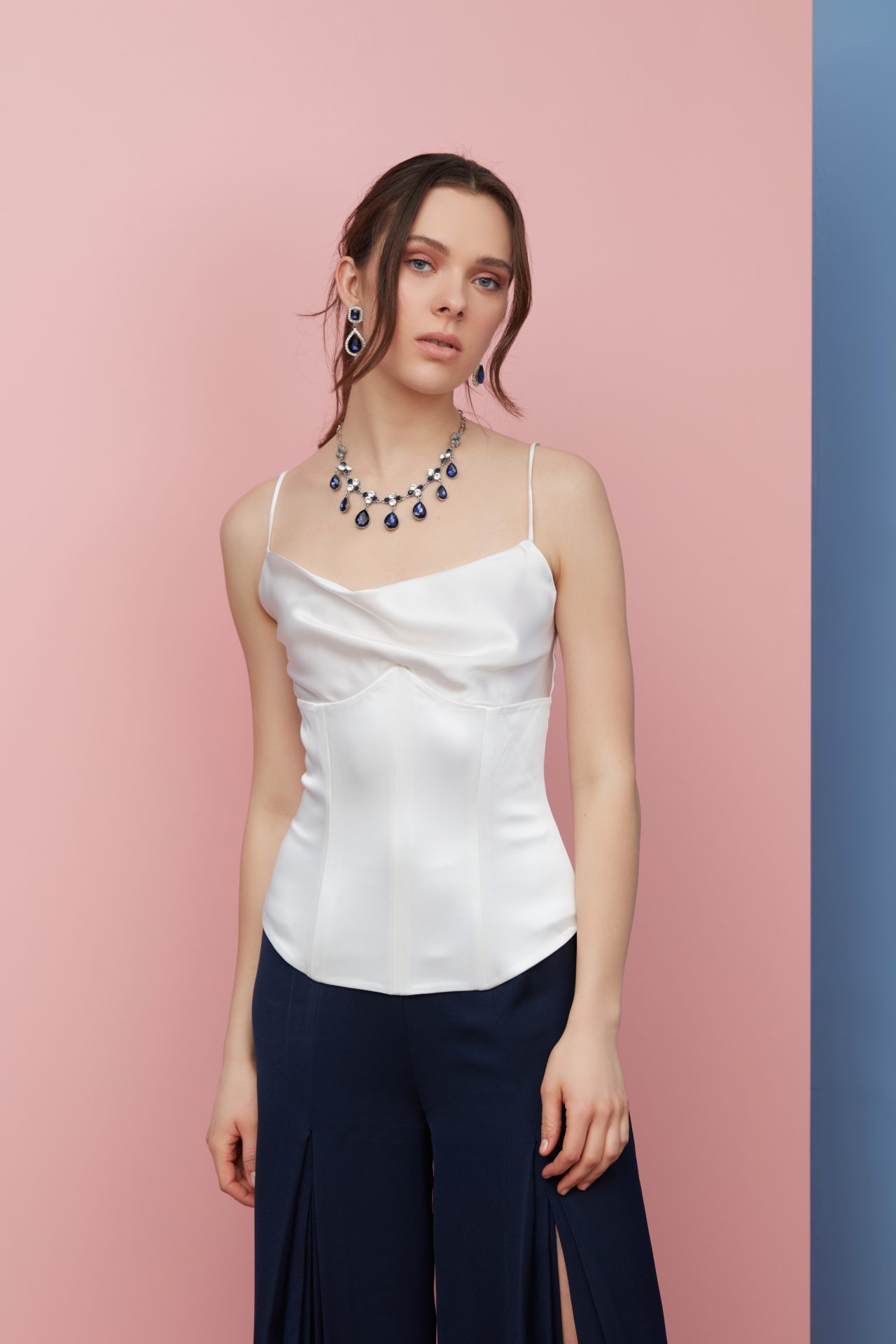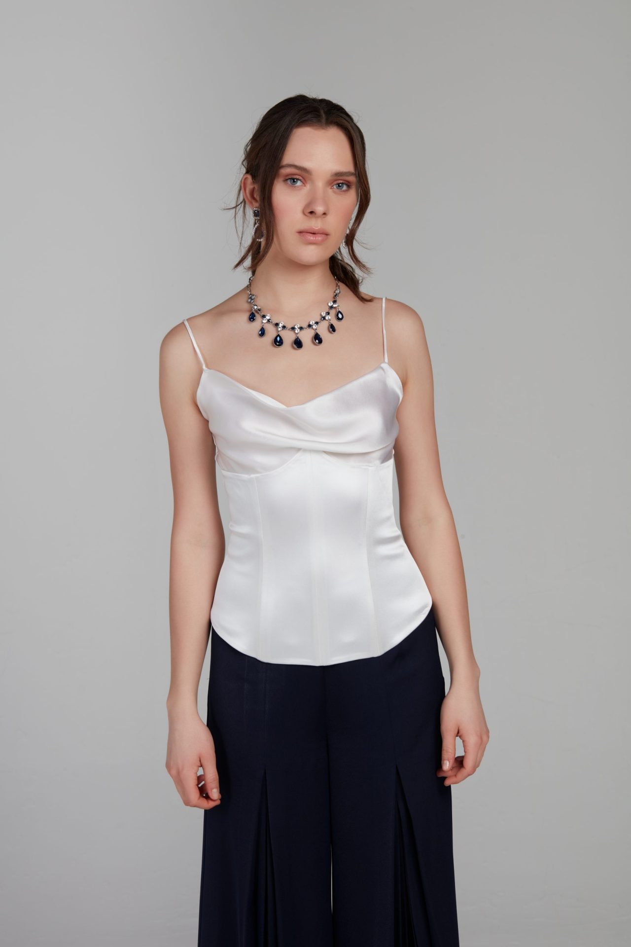 Degaje yaka detayı 5 balenli dantel kullanılarak yapılmış büstiyerle birleştirilmiştir. Sırtında kuş gözü deliklerden yine yakadakiyle aynı kumaştan yapılmış şeritle bağlanır.