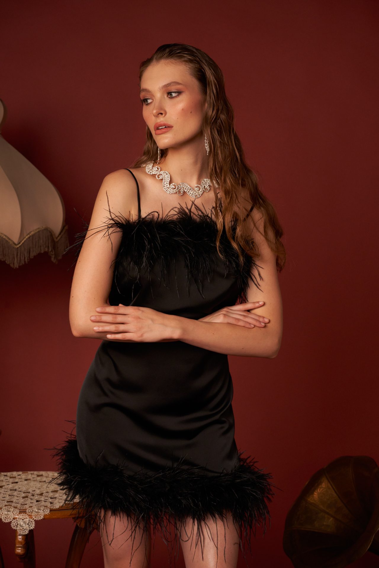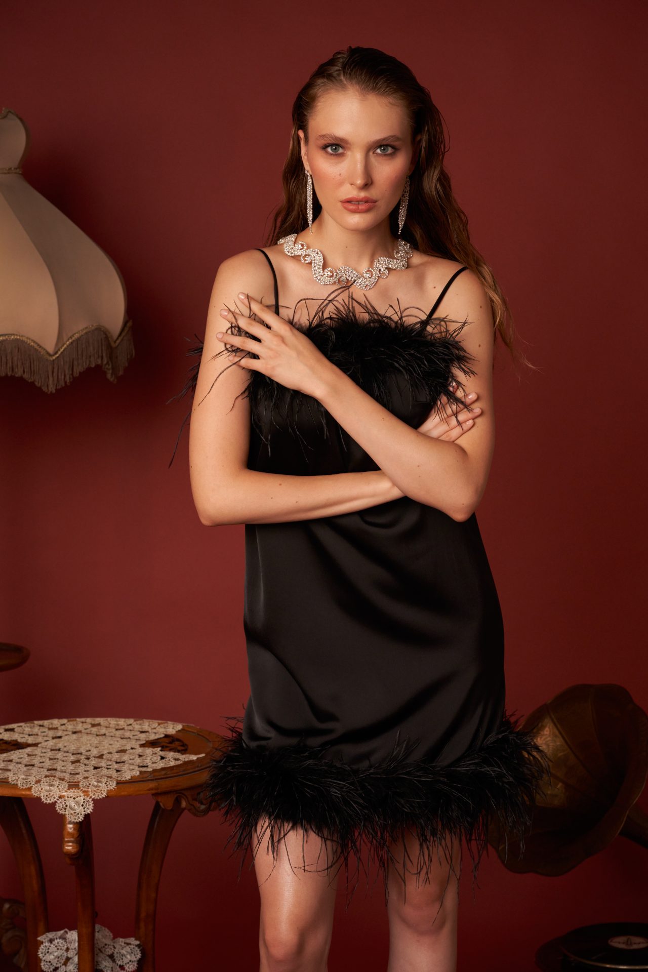 Devekuşu tüyleriyle hareketlendirilmiş askılı mini saten elbise